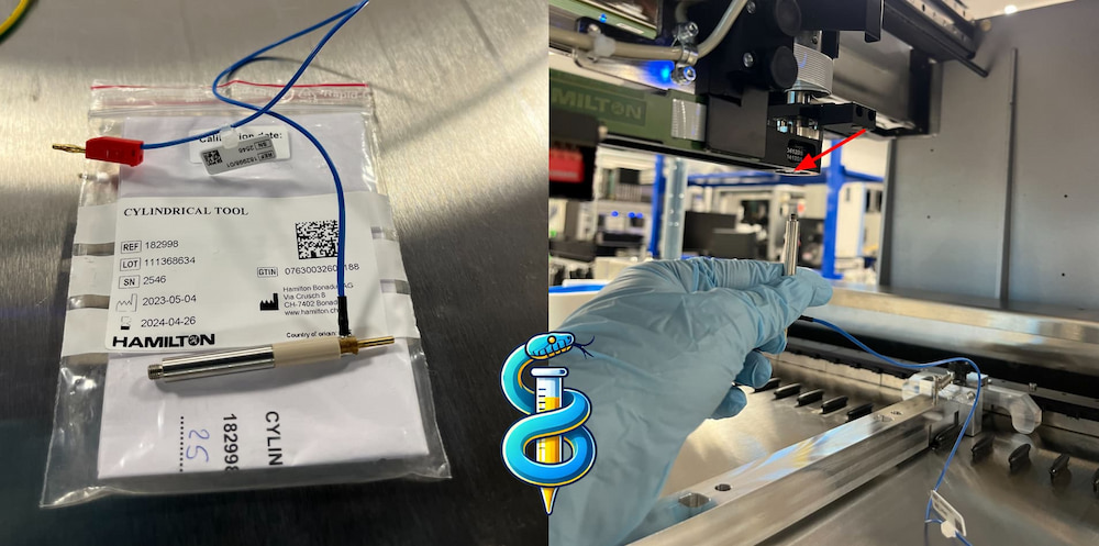 Critical: The taller Pipetting Channel Calibration Tool is used during the Adjust_iSWAP_above_Labware macro, instead of the short iSWAP adjustment tool used above.