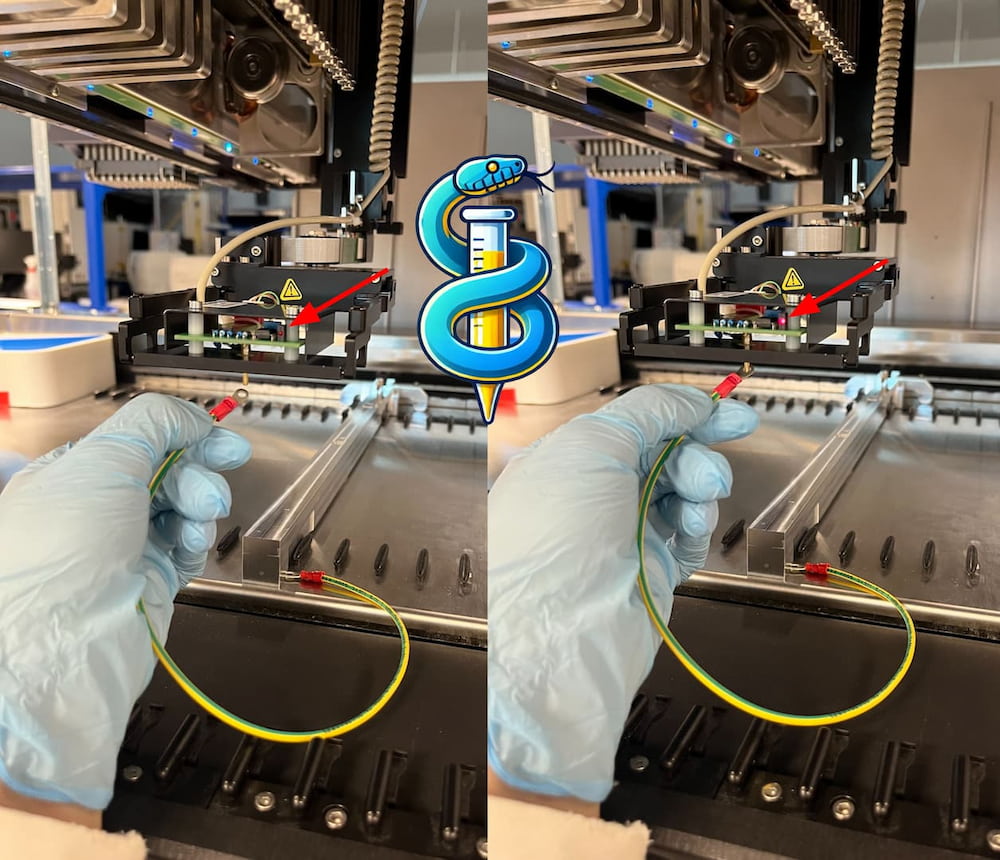 Connect the red wire plugs to the gripper tool. When ready, the final iSWAP calibration assembly looks like this: