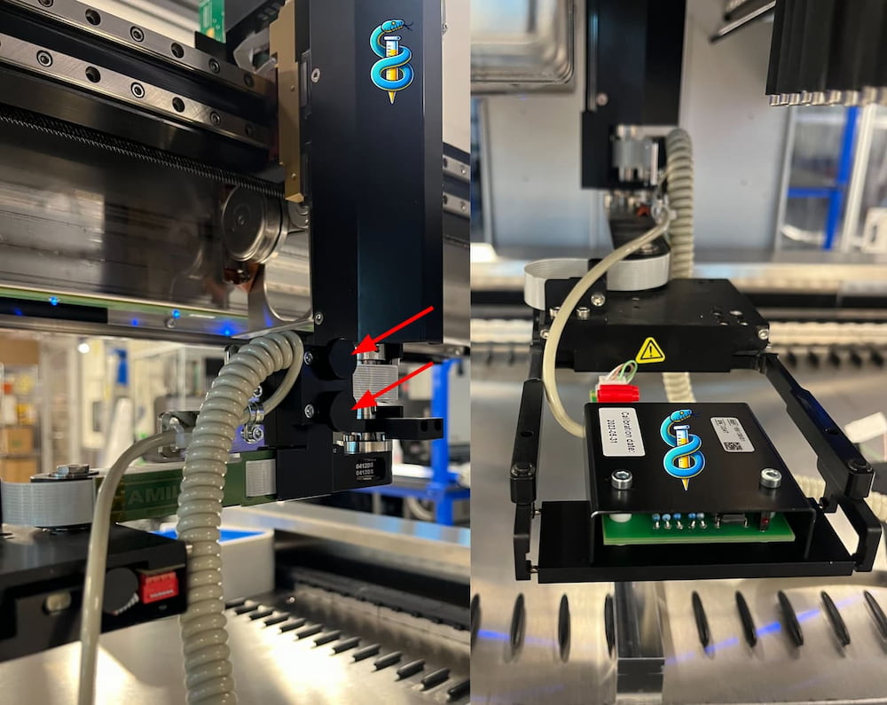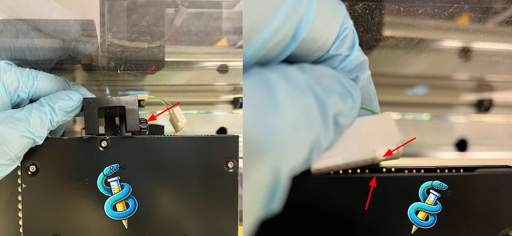Connect the red wire plugs to the gripper tool. When ready, the final iSWAP calibration assembly looks like this:
